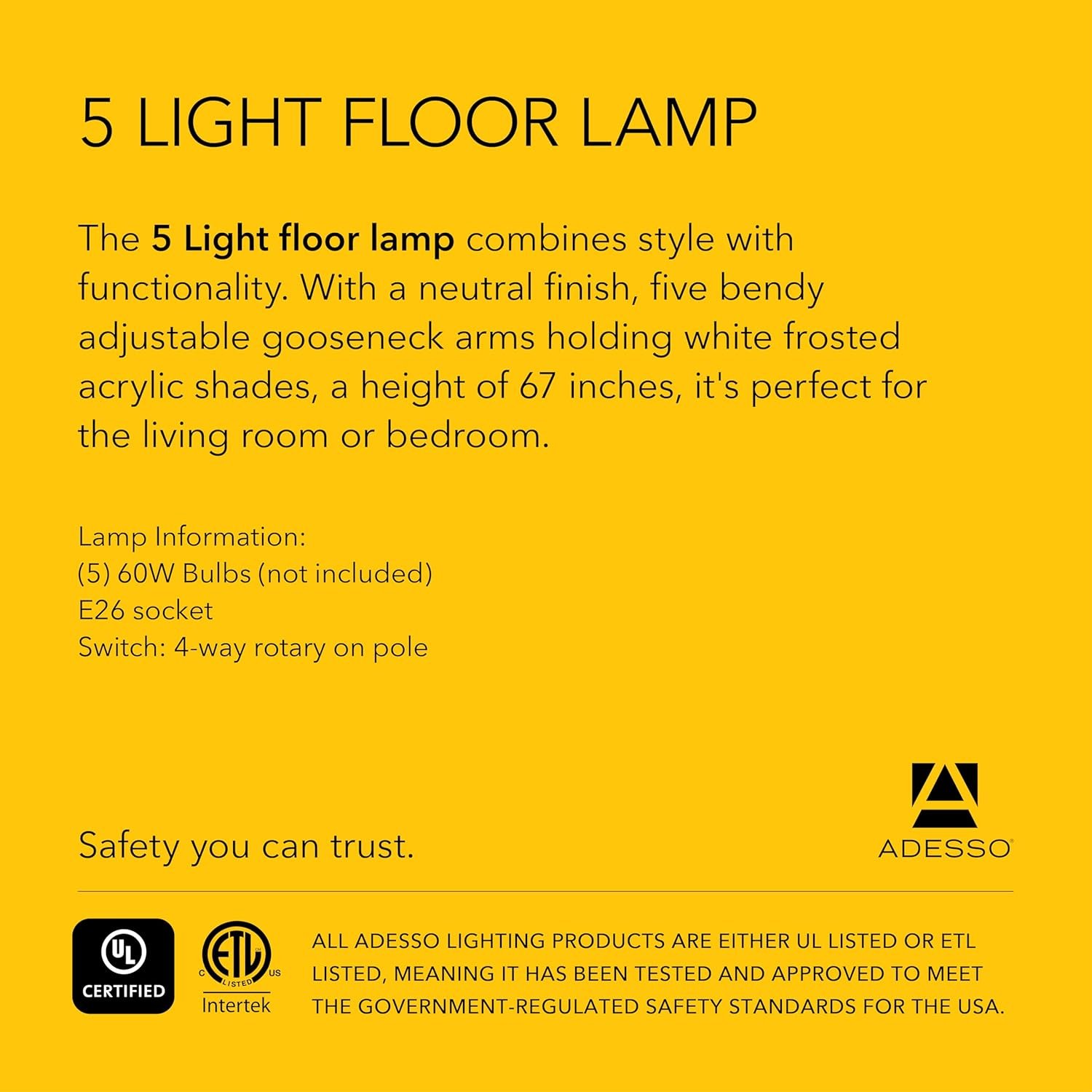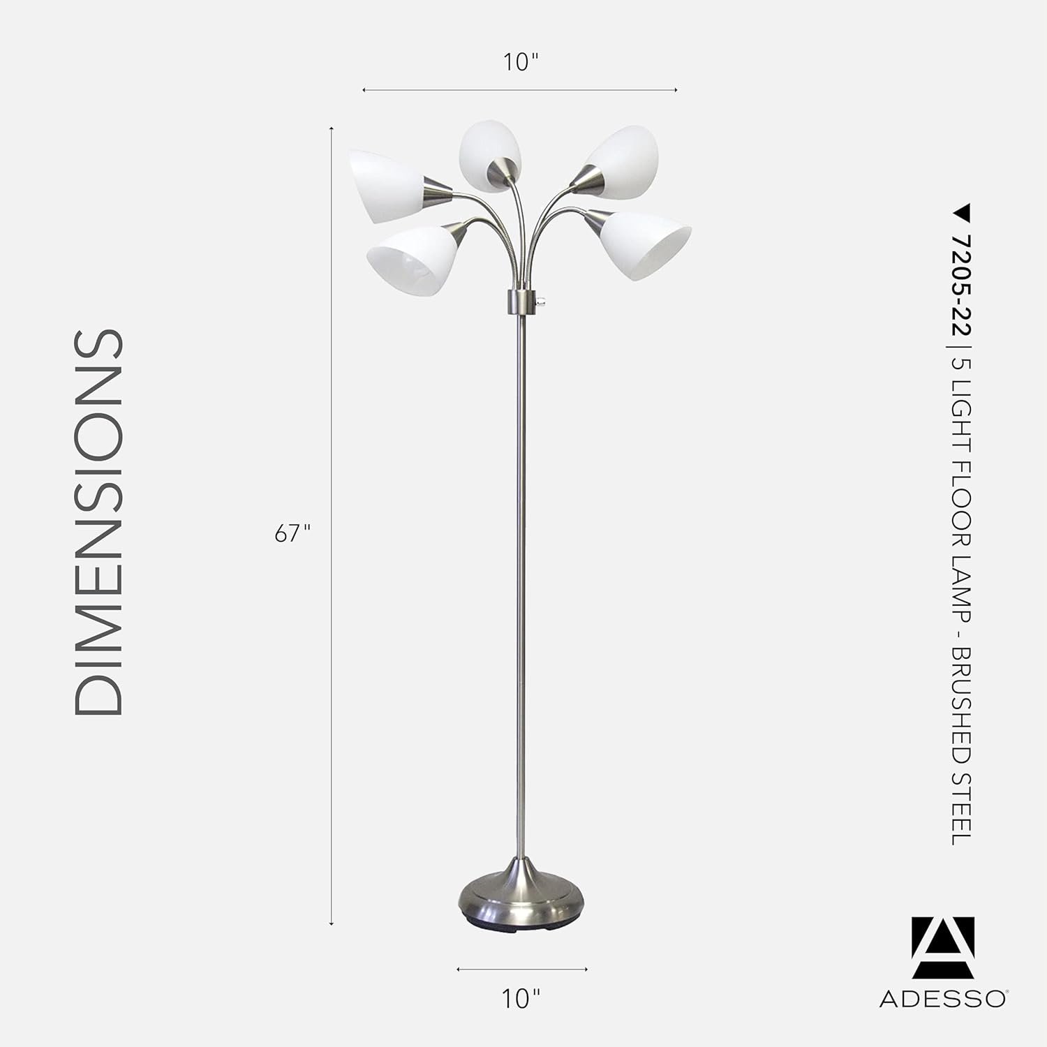 Illuminate your space with the Adesso Floor Lamp featuring 5 movable shades, allowing fully adjustable lighting to suit any mood or task. Its sleek brushed steel design complements modern and classic interiors, while the dimmable function provides customizable brightness. Perfect for living rooms, offices, or reading nooks, this versatile lamp combines style and functionality—upgrade your lighting today for a brighter, more flexible home.