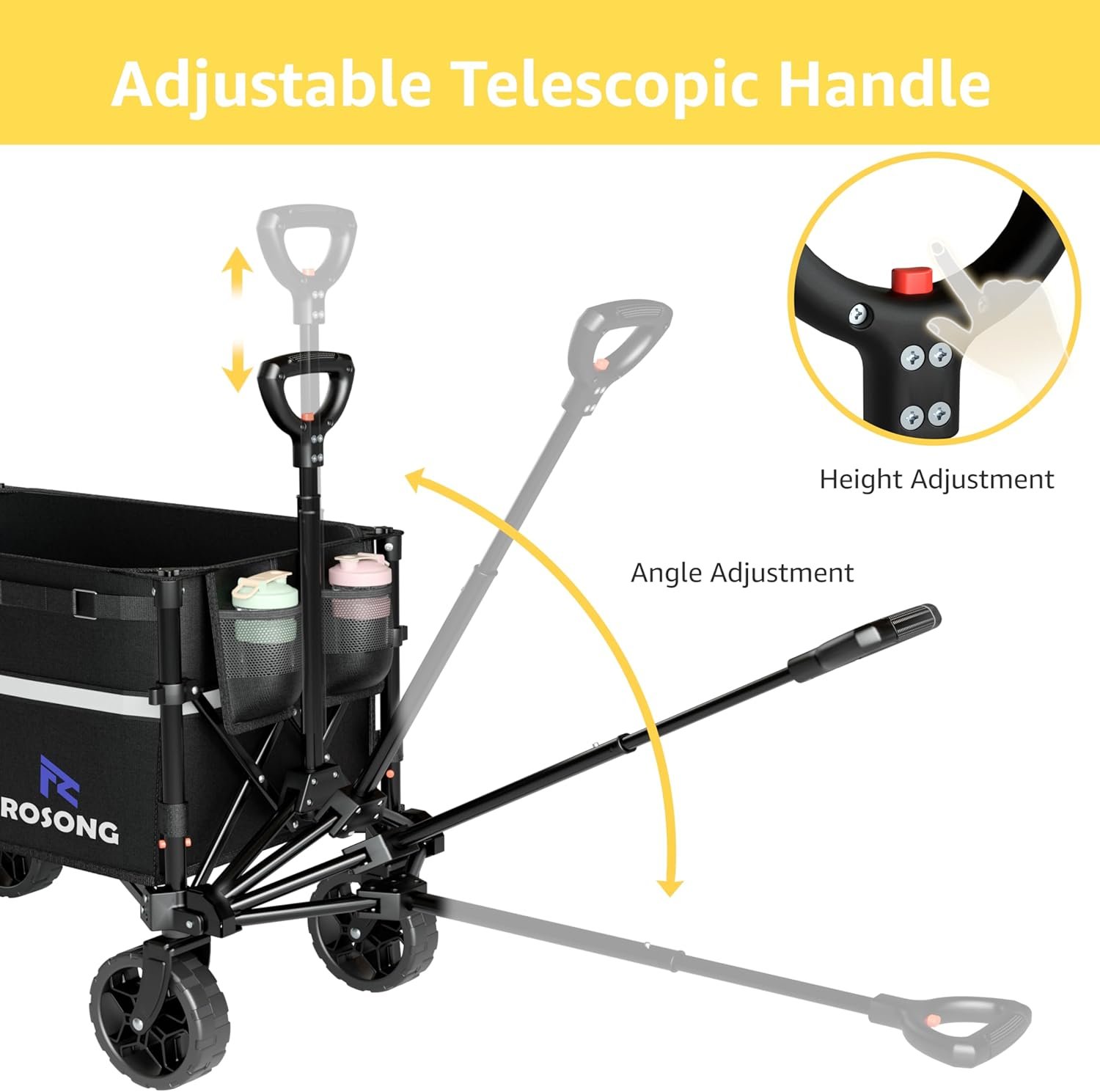 The ROSONG Collapsible Wagon is a heavy-duty, foldable utility cart built for easy outdoor hauling. With a durable steel frame, spacious fabric basket, and all-terrain wheels, it handles gardening, camping, beach trips, and more. Quick to fold and store, it’s a versatile, portable solution for transporting tools, supplies, or gear wherever you need it.