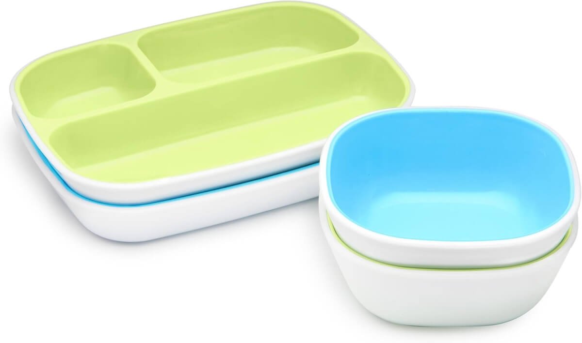 - The set includes (2) divided plates and (2) bowls with no-slip bottoms