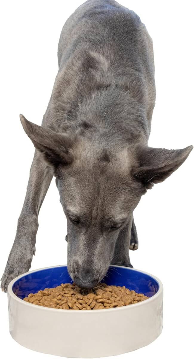A heavy‑weight ceramic bowl that stays put and holds 64 ounces of food or water. With a stylish light‑grey exterior and dark‑blue interior, it blends well into most décor while being easy to clean in the dishwasher.